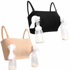 Next is a pair of hands-free breast pump bras. You get two bras, which are available in 4 sizes. You can also choose the color combination – either two beige, two black, or one of each. The bras are made from a mostly cotton blend. It is 92% cotton, 8% spandex, to increase the elasticity of the pumping bra and help it stretch to accommodate your size. This increases comfort. They are also machine washable. And, it comes with a money-back guarantee. The bar holds well and should be able to help prevent leaking while pumping, while also allowing your hands to remain free.