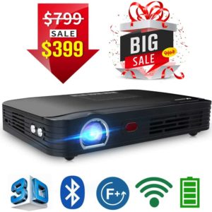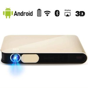 The Wowoto Pro Mini is quite the portable projector. Displaying an impressive 4000 lumens, the Wowoto can support screens as large as 150″ (87″ x 116″). Despite its bright image projection, it uses advanced DLP technology plus an LCD light source, that poses no threat to eye damage. This projector is great for both business and pleasure with its HD display, business presentations, games, or movies come to life. With 8GB of storage and running Andriod 4.4, there is plenty of room for hundreds of applications.
