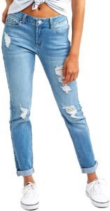 Hybrid & Co. women’s comfy stretch jeans are a good budget pick. They are made from a thin fabric using spandex to make it easy to stretch, allowing for a tight fit. Due to their fit, the jeans offer a modern, feminine, sexy look that is more suitable for the younger audience especially due to their tears above the knees. They are made to enhance the natural curves of the body. The jeans are also quite comfortable to wear and can be found in over 30 different colors.